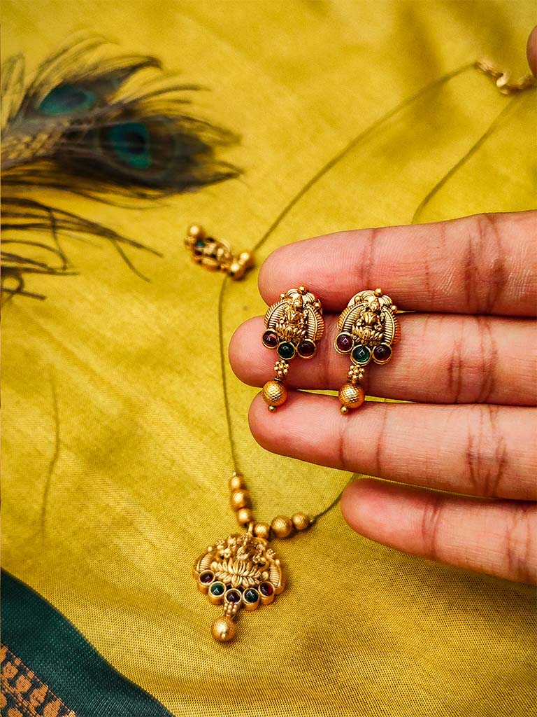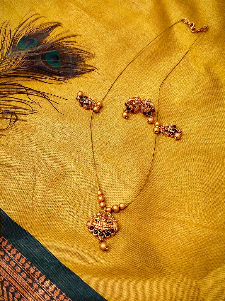 This antique gold-plated necklace set features a beautifully crafted floral pendant adorned with green and black stones, symbolizing grace and charm. The intricate detailing and delicate beadwork reflect traditional craftsmanship, while the matching earrings complete the look with harmony and sophistication.