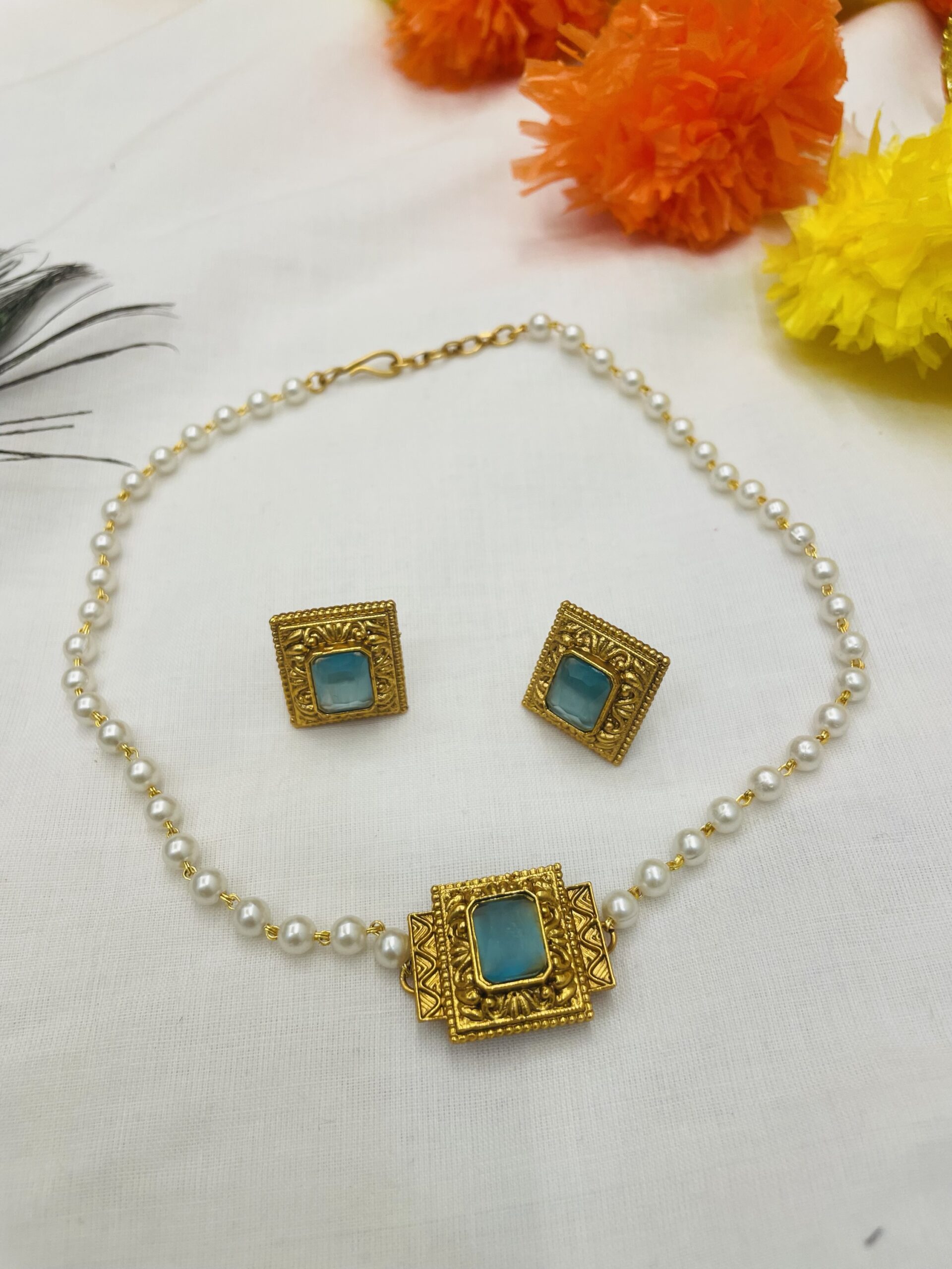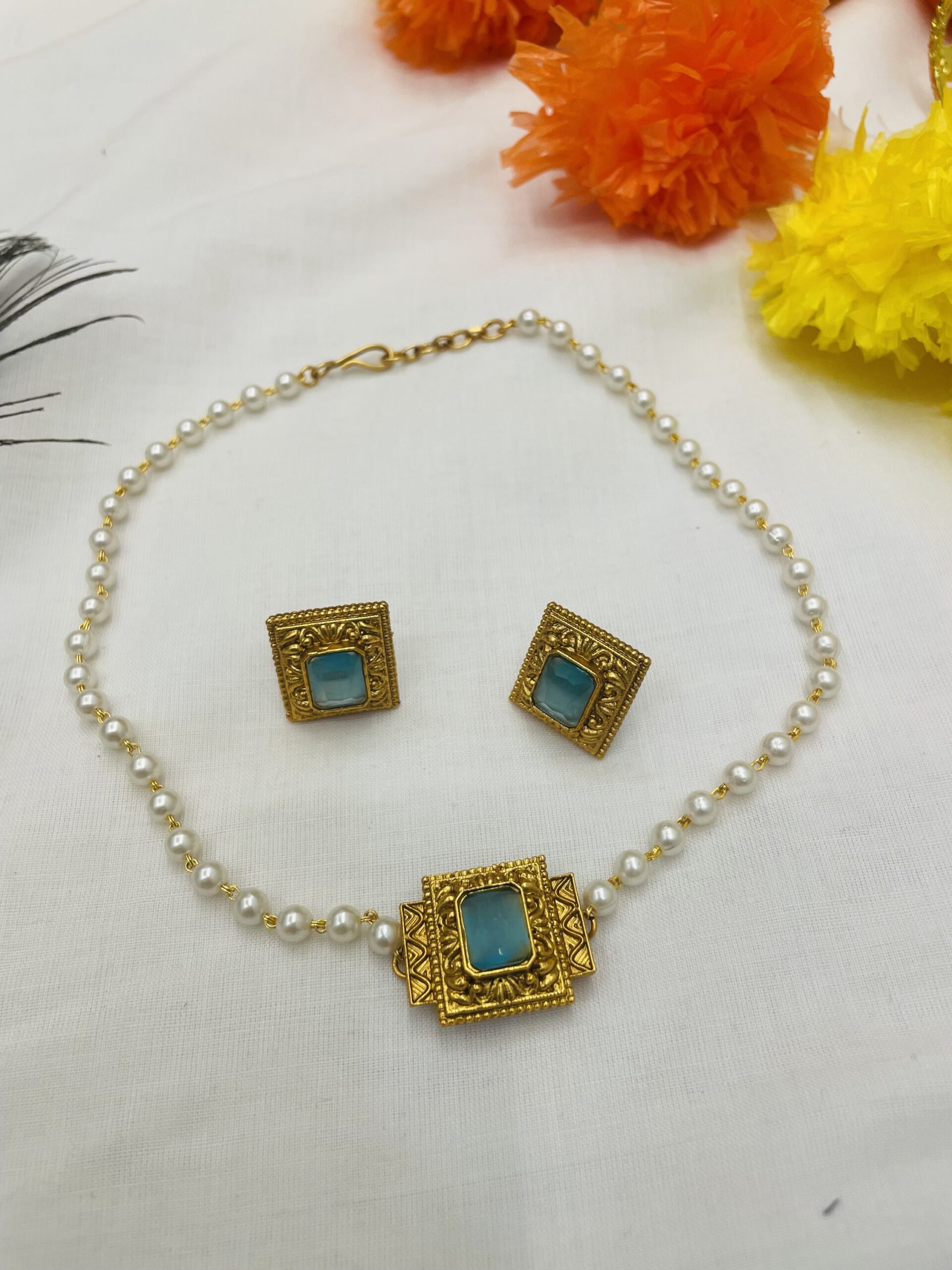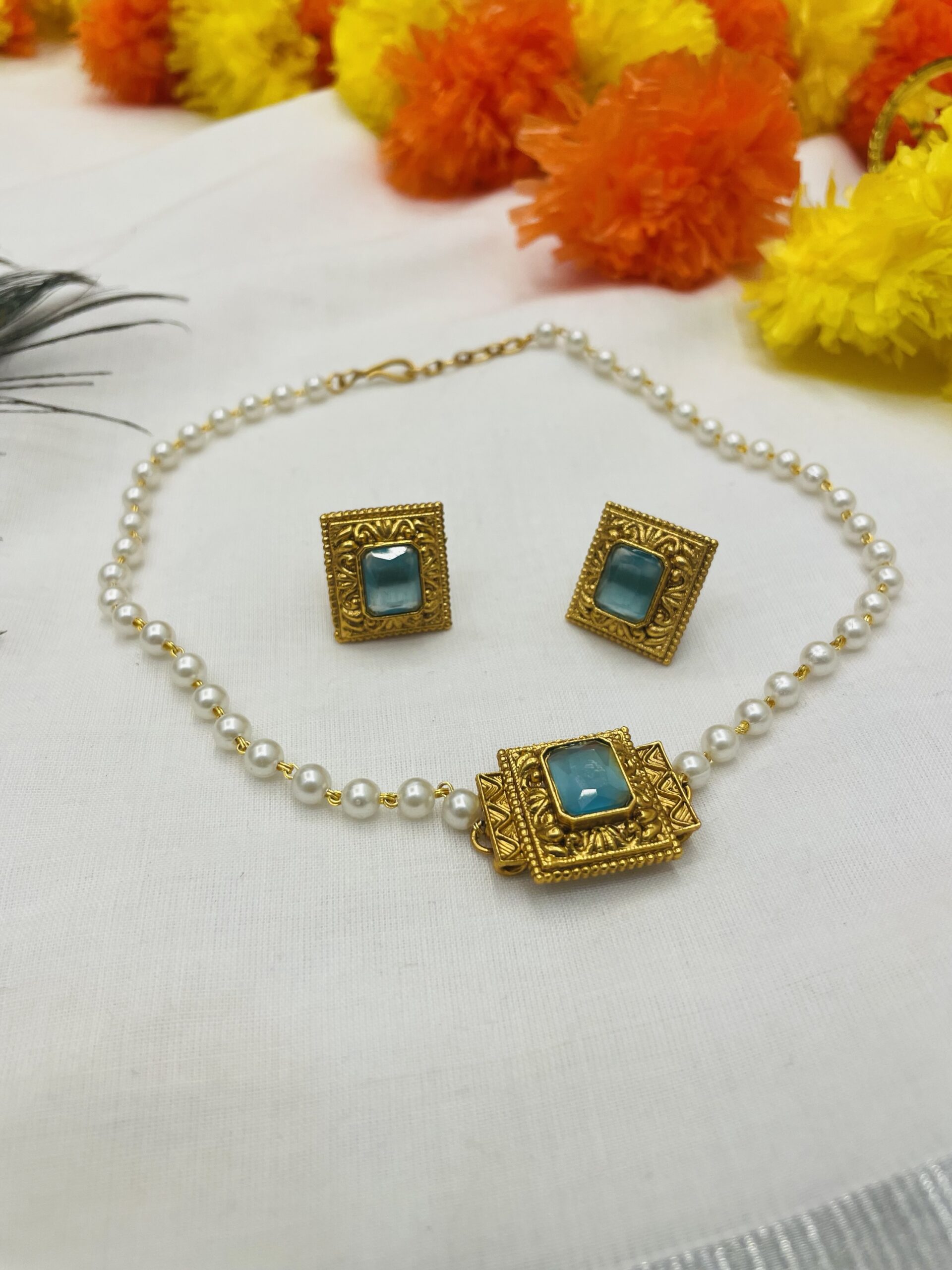A chic pearl choker with antique gold detailing and a bold blue stone centerpiece, paired with matching studs. Perfect to elevate your festive and wedding looks with a touch of elegance.