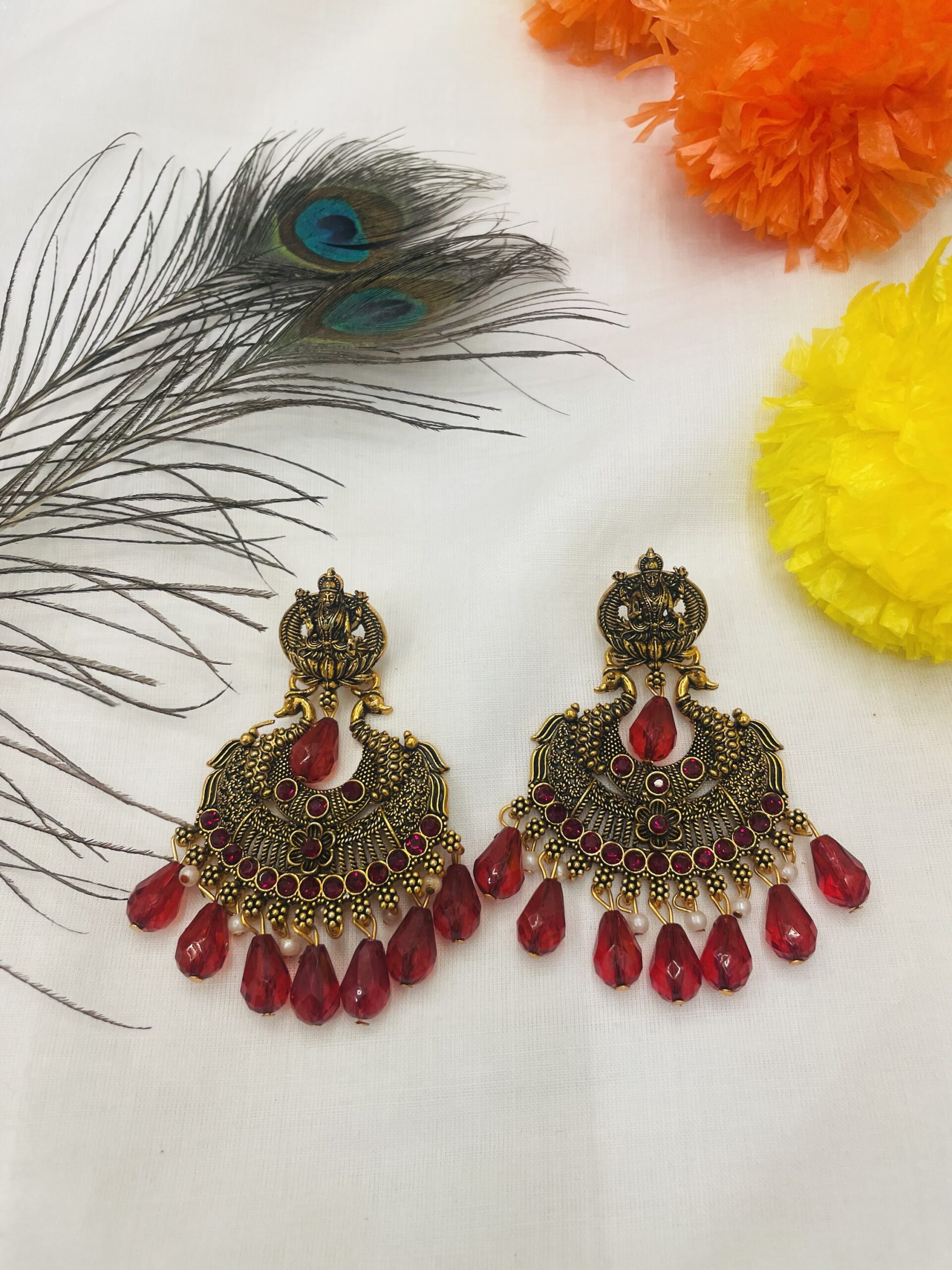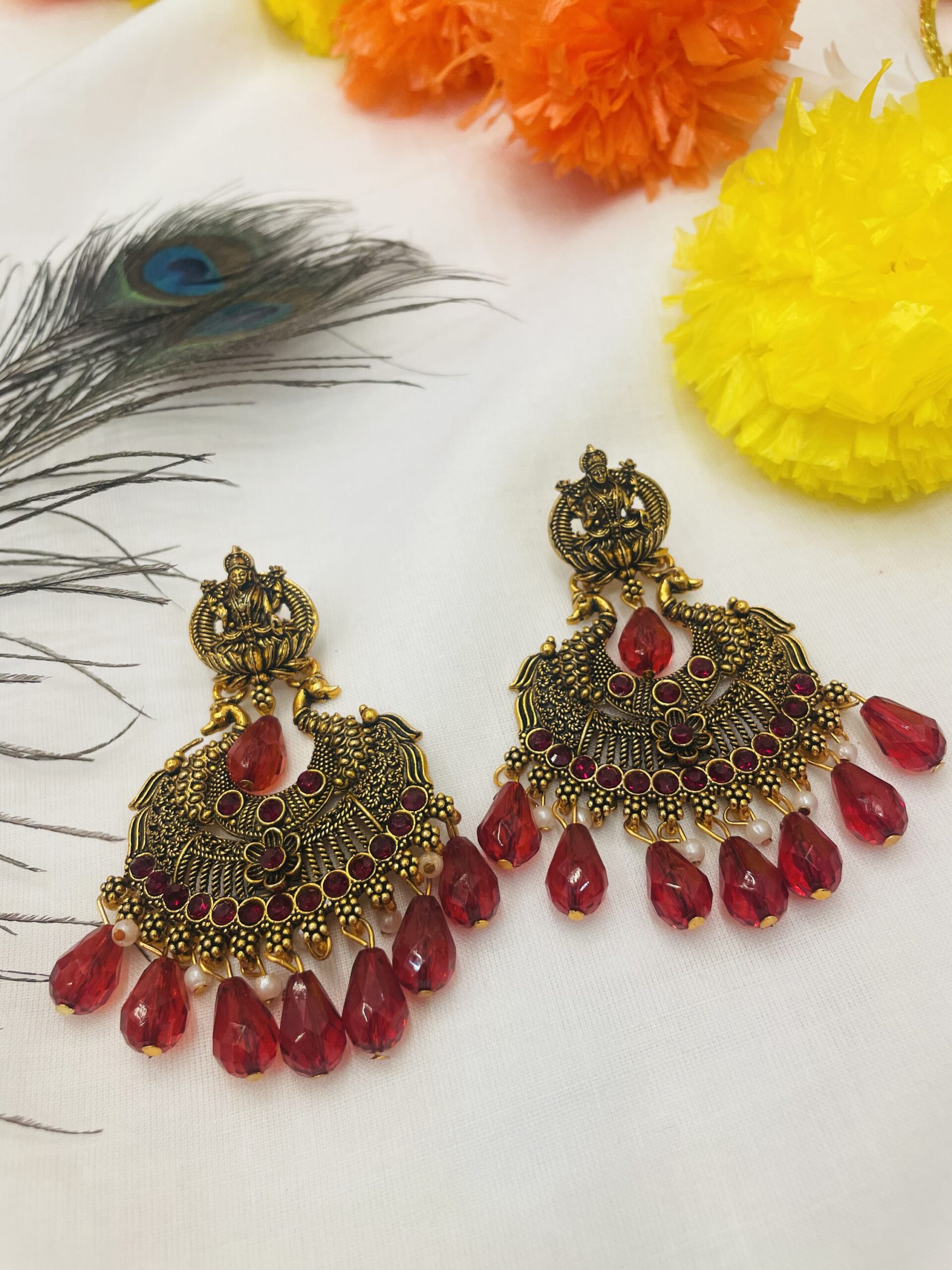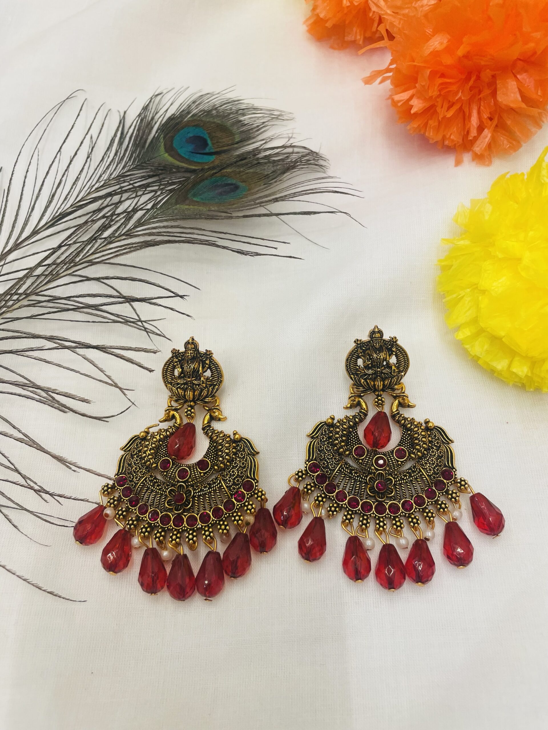 Antique temple-style earrings featuring Goddess Lakshmi motifs, intricate peacock designs, and a row of vibrant red stones. Finished with bold red bead drops and delicate pearls, these earrings are perfect for festive and bridal occasions.”