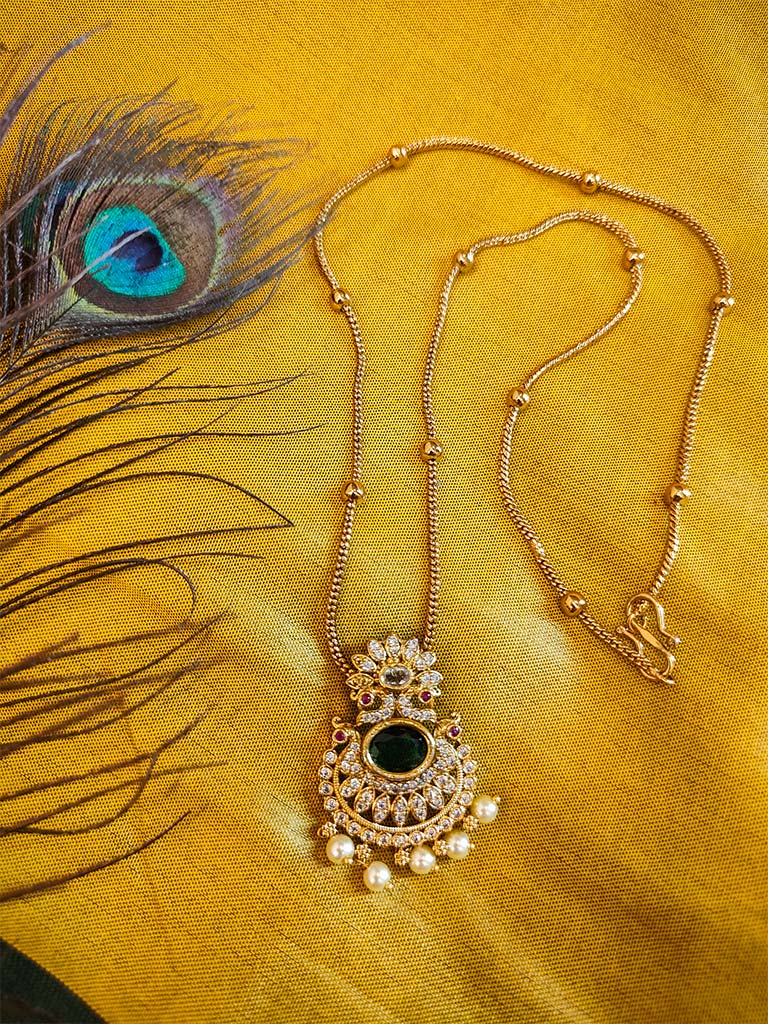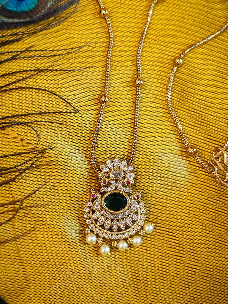 This antique gold-plated necklace features a richly detailed pendant with a dark green central stone, framed by white stones, pearls, and vibrant red accents. A delicate floral motif crowns the design, while the gold bead chain adds subtle charm. Set against a peacock feather backdrop, it evokes regal tradition and festive beauty.