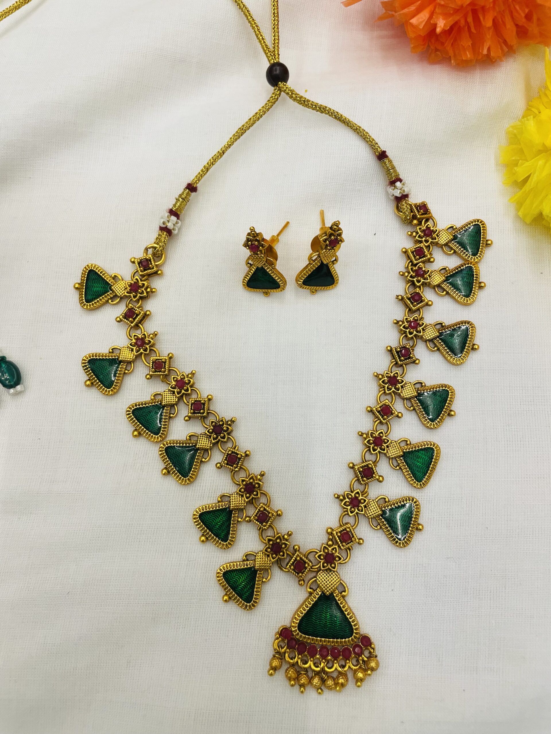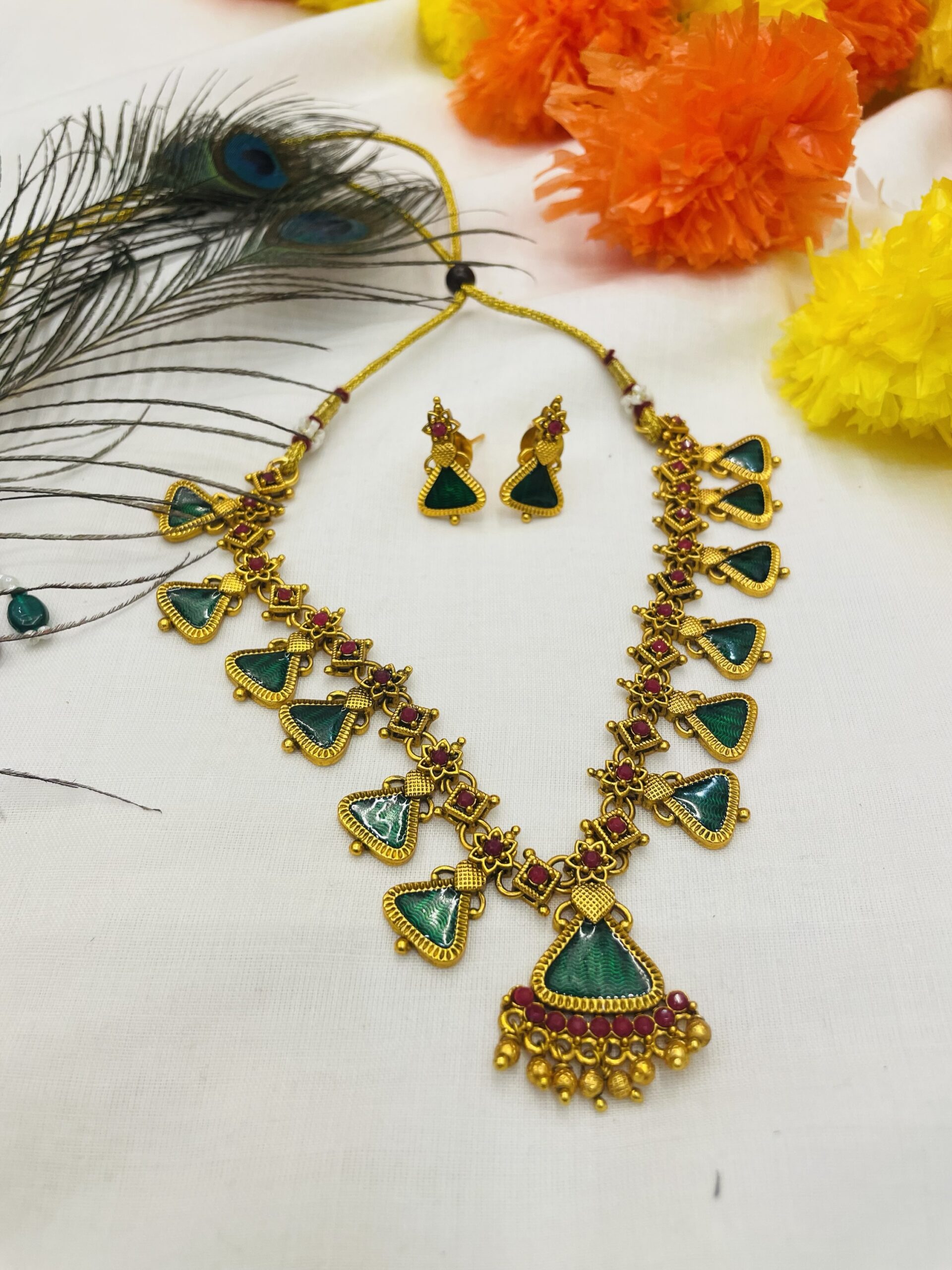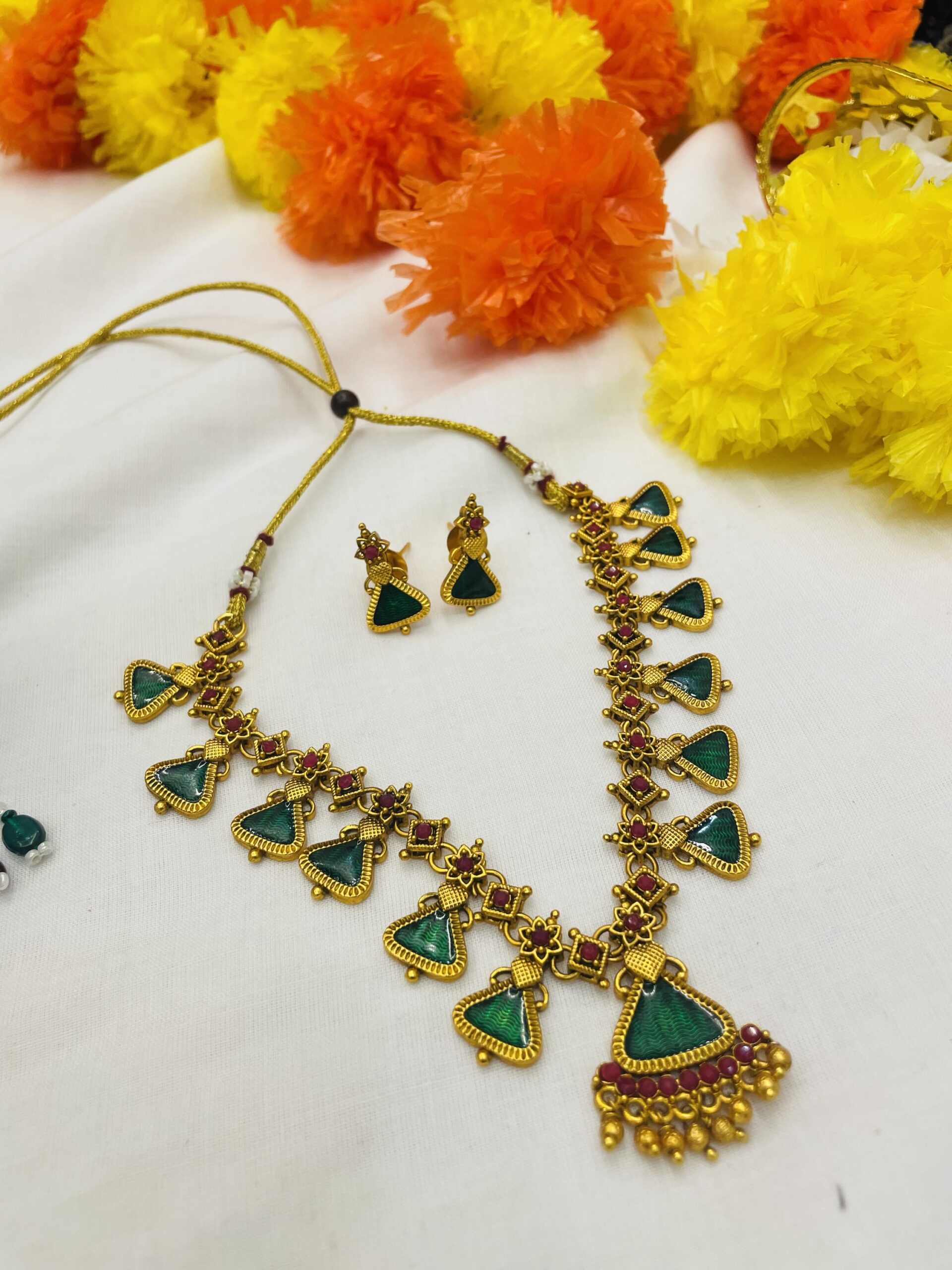 “A traditional necklace set featuring intricate floral motifs with green enamel drops and red stone accents, finished with a bold pendant and matching earrings. A perfect choice to complete your festive and ethnic look.”